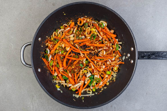 Den Gemüsemix in einer großen Pfanne mit 1EL Olivenöl bei mittlerer Hitze 5–7Min anbraten, bis das Gemüse weicher wird und leicht bräunt. Vom Herd nehmen und die Gewürzmischung, ½TL Salz und 1 kräftige Prise Pfeffer unterrrühren.