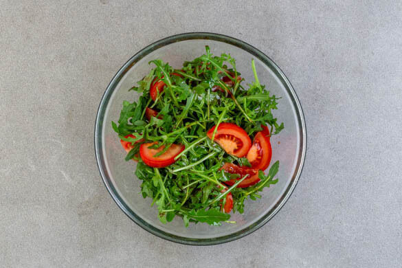 2EL Olivenöl, 1EL Balsamicoessig und je 1 Prise Salz und Pfeffer zu einem Dressing verrühren. Die Tomate in schmale Spalten schneiden und mit dem Rucola und dem Dressing vermengen.