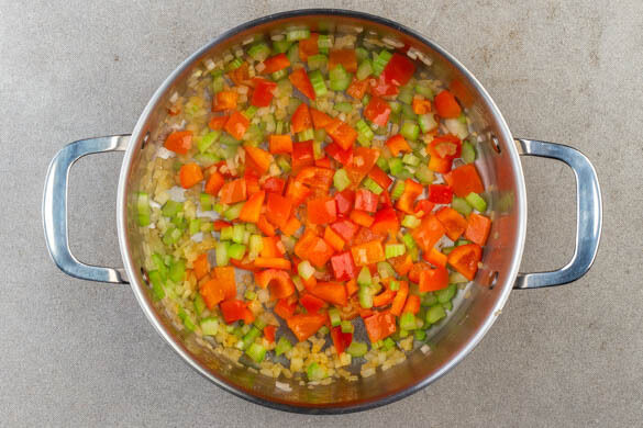 Die Zwiebeln schälen, halbieren und fein würfeln. Den Sellerie fein würfeln. Die Paprika vierteln, entkernen und in kleine Würfel schneiden.