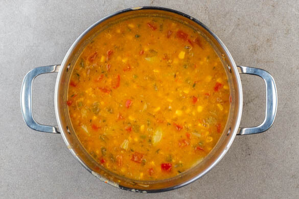 Die Kartoffeln, den Mais, die ½ des Brühgewürzes und 500ml Wasser in den Topf geben und zum Kochen bringen, dann alles abgedeckt bei niedriger Hitze 10–15Min. köcheln lassen, bis die Kartoffeln gar sind.