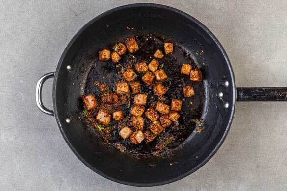 In einer mittelgroßen Pfanne ½EL Olivenöl bei mittlerer bis starker Hitze erwärmen. Den Fisch in das heiße Öl geben und ca. 2Min., dabei regelmäßig die Pfanne rütteln, damit die Fischwürfel nicht anhaften. Die Lauchzwiebeln dazugeben und ca. 1Min. mitbraten. Dann die Hitze reduzieren, den Fisch mit der Sauce ablöschen und bei niedriger Hitze noch ca. 30Sek. weitergaren.