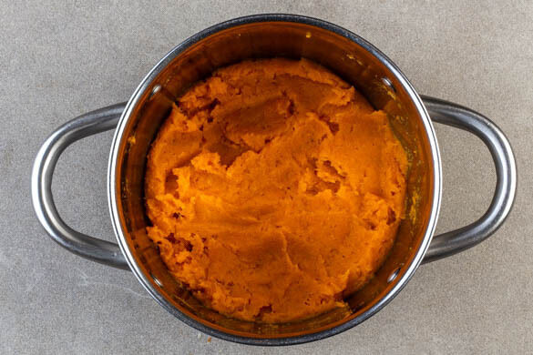 Mit einer Tasse etwas Kochwasser abschöpfen, dann die Süßkartoffeln in ein Sieb abgießen. Zurück in den Topf geben und zu einem cremigen Püree stampfen, dabei nach Bedarf Kochwasser hinzugeben. Tipp: Wer mag, kann noch etwas Butter oder Olivenöl hinzufügen. Mit 1 Prise Salz würzen.