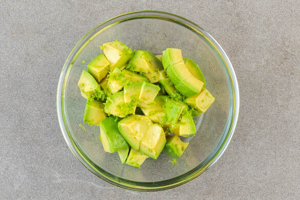 Die Avocado halbieren, den Kern entfernen und das Fruchtfleisch in der Schale kreuzweise einschneiden. Die vorgeschnittenen Avocadowürfel mit einem Löffel aus der Schale lösen. Die Limettenschale abreiben und die Limette halbieren, eine Hälfte auspressen, die andere Hälfte in Spalten schneiden.
