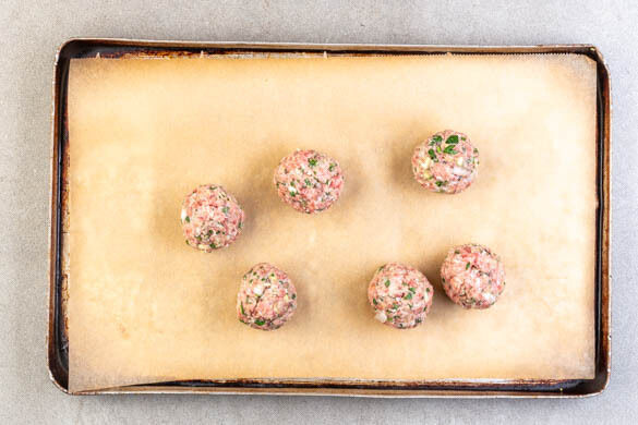 Die Hackbällchen mit 2EL Olivenöl beträufeln und 8Min. im Ofen backen. Dann auf 220°C und Grillfunktion umschalten und weitere 4–6Min. backen. Tipp: Alternativ die Temperatur auf 240°C (220°C Umluft) erhöhen, wenn keine Grillfunktion vorhanden ist. Wenn die Bällchen gar sind, das Blech aus dem Ofen nehmen und die Temperatur wieder auf 200°C (180°C Umluft) reduzieren.