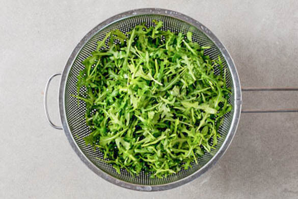 Den Rucola ggf. verlesen und den unteren Teil der Stiele abschneiden.