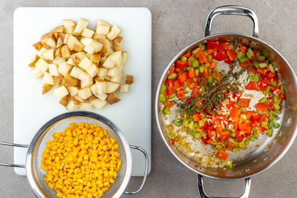 Inzwischen die Kartoffeln grob in ca. 1,5cm große Würfel schneiden. Den Knoblauch schälen und fein würfeln. Den Mais in ein Sieb abgießen und abtropfen lassen. Den Knoblauch, die ½ des Thymians und die Gewürzmischung in den Topf einrühren und ca. 1Min. duftend mitbraten.