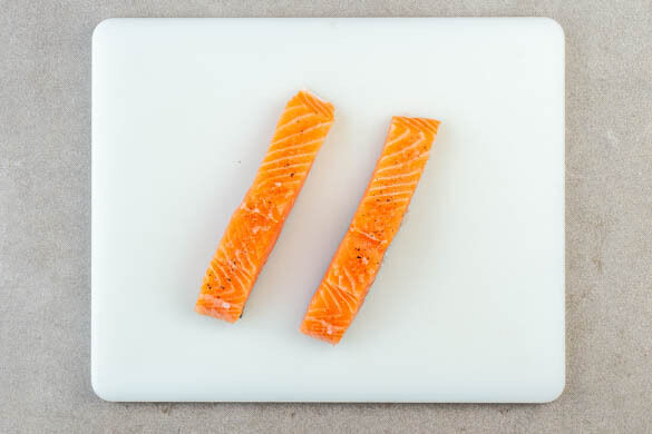 Den Fisch kalt abspülen, trocken tupfen und evtl. vorhandene Gräten und Schuppen entfernen. Mit je 1 Prise Salz und Pfeffer würzen.