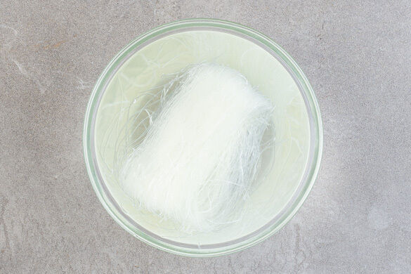Die Nudeln mit heißem Wasser bedecken und 3–5Min. ziehen lassen. In ein Sieb abgießen, kalt abschrecken und abtropfen lassen. Tipp: Um die Weiterverarbeitung zu erleichtern, ggf. die Nudeln mit einer sauberen Schere 1–2 Mal durchschneiden.