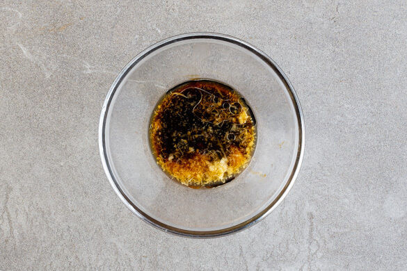 In einem Wasserkocher ausreichend Wasser für die Nudeln zum Kochen bringen. Die Teriyakisauce mit der Knoblauch-Ingwer-Paste, 2EL Pflanzenöl, 2EL hellem Essig sowie je 1 kräftigen Prise Salz und Pfeffer verrühren.