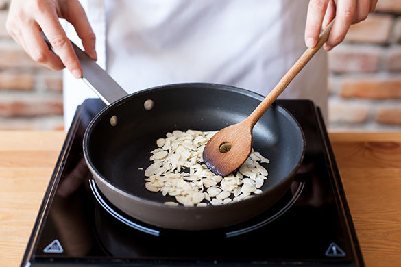 Kleine Pfanne auf mittlere Stufe erhitzen. Mandelblättchen ohne Fett unter Rühren goldbraun rösten. Vorsicht: Die Mandelblättchen können leicht verbrennen.