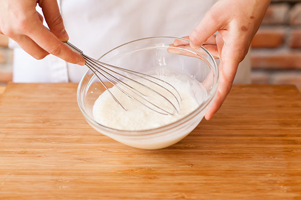 Sahne und die Hälfte des Puderzuckers mithilfe eines Schneebesens oder eines Handrührgeräts steif schlagen. Die Sahne sollte dafür noch kühl sein, ansonsten kurz ins Gefrierfach stellen. Nicht zu lange schlagen, sonst wird aus der Sahne Butter.