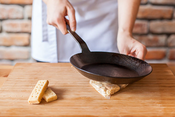 Kekse aus der Verpackung nehmen, in eine Tüte geben und mit einer schweren Pfanne darauf schlagen, bis sie krümelig sind, nicht zu fein.
