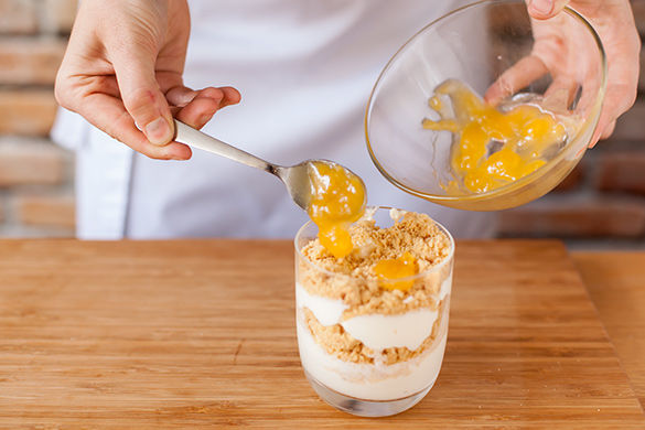 Sahne, Kekse und Lemon Curd abwechselnd in gleichmäßigen Schichten auf 2 Serviergläser verteilen. Es sollten 2 Schichten entstehen. Am besten zuerst Sahne, Kekse und zum Schluss Lemon Curd schichten.