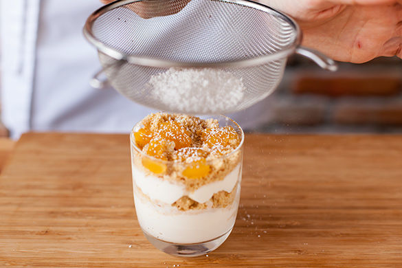 Nun den restlichen Puderzucker mithilfe eines feinen Siebes über die geschichtete Creme streuen.