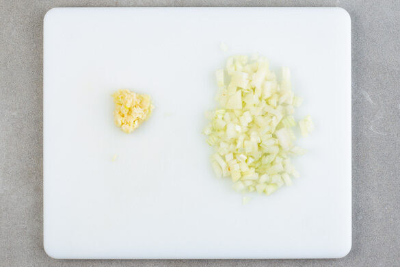 Den Backofen auf 240°C (220°C Umluft) vorheizen. Die Zwiebel schälen, halbieren und fein würfeln. Den Knoblauch schälen und ebenfalls fein würfeln.