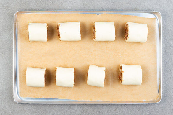 Den Teig mit dem Papier nach unten auf einem Backblech ausrollen. Das Hackfleisch zu einer Rolle formen und mit dem Teig umwickeln. Mit der Naht nach unten auf das Blech legen, mit einem scharfen Messer in 8 Scheiben schneiden und im Ofen 15–20Min. backen, bis der Teig goldbraun und knusprig und das Fleisch gar ist.