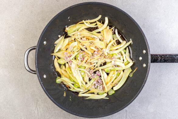 Den Fisch auf einem Teller beiseitestellen. Den Fenchel in derselben Pfanne mit ½EL Olivenöl bei mittlerer bis starker Hitze 2–3Min. braten, bis er weich ist. Dann die Schalotten hinzugeben und 1–2Min. mitbraten, bis sie glasig sind.