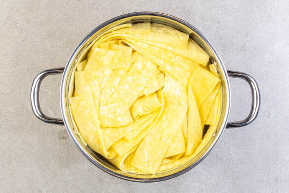 Die Lasagneblätter längs in ca. 2,5cm breite Streifen schneiden, in das kochende Wasser geben und in ca. 5Min. bissfest kochen. Mit einer Tasse etwas Pastawasser abschöpfen, dann die Pasta in ein Sieb abgießen.