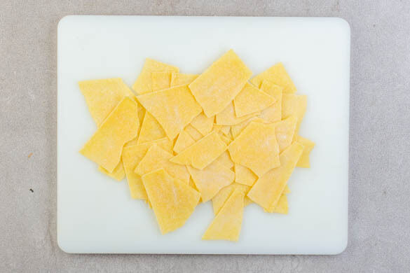 Währenddessen die ½ der Lasagneblätter in grobe Stücke zerbrechen oder schneiden. Die übrigen Lasagneblätter werden für dieses Rezept nicht benötigt.