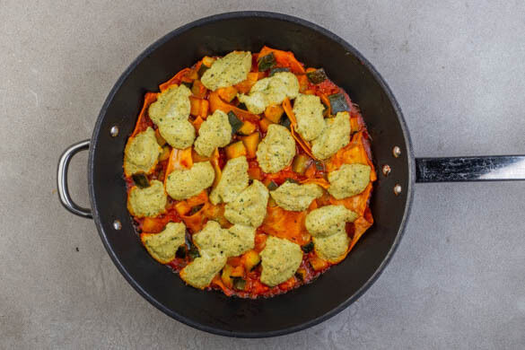 Lasagne aus der Pfanne? Dies entspricht nicht unbedingt der üblichen Zubereitungsweise des italienischen Klassikers, dennoch ist es durchaus möglich. Der aus Tofu, Cashewkernen, Hefeflocken und Basilikum selbst gemachte Ricotta ist komplett milchfrei. Die rote Sauce stammt von fruchtig passierten Tomaten, wo sich auch Zucchini und Zwiebeln verstecken. Herzhaft, bunt und angenehm mild – perfekt für kleine und große Pasta-Fans.