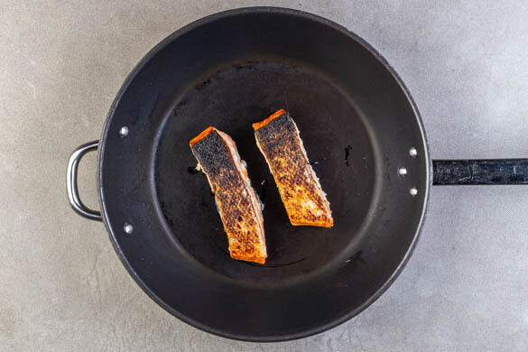 Den Fisch mit kaltem Wasser abspülen, trocken tupfen und evtl. vorhandene Gräten oder Schuppen entfernen. Mit 1 Prise Salz würzen. ½EL Olivenöl und den Fisch mit der Hautseite nach unten in eine kalte große Pfanne geben. Die Pfanne langsam auf mittlerer Hitze erwärmen und den Fisch 5–6Min. braten, bis der er zu ca. 90% durchgegart ist. Dann wenden und weitere 2–3Min. braten.