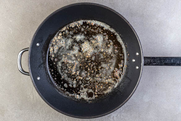 Den Fisch aus der Pfanne nehmen und beiseitestellen, die Pfanne nicht auswischen. ½TL Pfeffer für die Garnitur aufbewahren, den restlichen Pfeffer und 2EL Olivenöl in die Pfanne geben und bei mittlerer Hitze ca. 1Min. anbraten, bis der Pfeffer anfängt zu duften. Die Hitze reduzieren, 2EL Butter in die Pfanne geben und unter Schwenken schmelzen lassen, dabei alles verrühren.