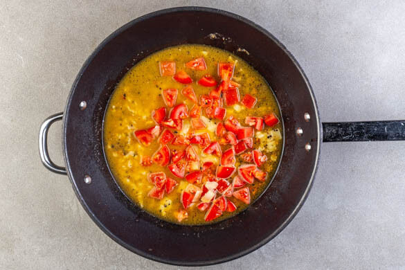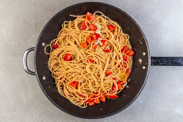 Das Pastawasser, die Tomaten sowie den Käse in die Pfanne geben und rühren, bis der Käse geschmolzen ist. Die Sauce weitere 2–3Min. köcheln lassen und mit 1 kräftigen Prise Salz abschmecken.