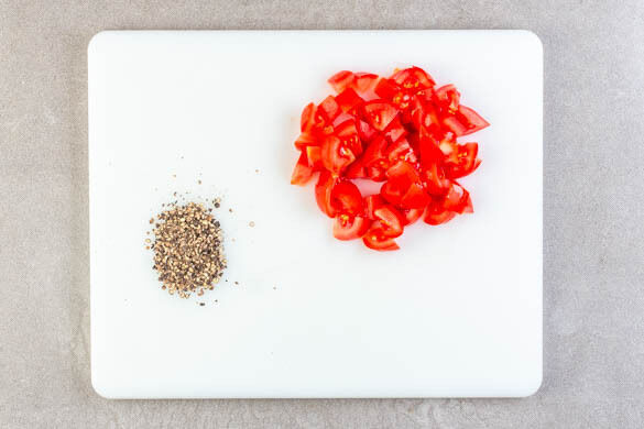 In einem mittelgroßen Topf ausreichend gesalzenes Wasser für die Pasta zum Kochen bringen. Währenddessen ½EL Pfefferkörner in einer Pfeffermühle mahlen oder in einem Mörser zerstoßen. Tipp: Für dieses Rezept eignen sich ganze Pfefferkörner besser als bereits gemahlener Pfeffer. Die Tomaten in ca. 1cm große Würfel schneiden.