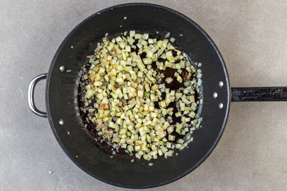 Den Fenchel und die Schalotten in der Pfanne mit 1EL Olivenöl bei mittlerer Hitze in 2–3Min. glasig anbraten, dann mit 1 Prise Salz würzen.