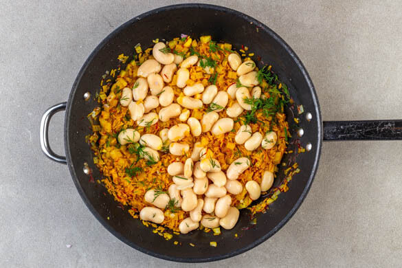 Etwas Dill für die Garnitur beiseitestellen. Nach ca. 9Min. Garzeit des Fenchel-Safran-Reises die Bohnen, den restlichen Dill und 1EL hellen Essig zugeben und unterrühren.