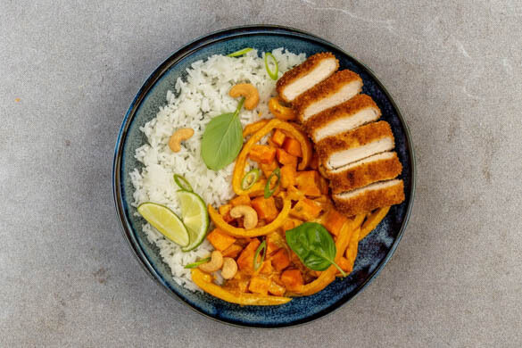 Ein Curry, das mit der Sonne um die Wette strahlen könnte. Die tolle Farbe, die auf deinem Teller so herrlich leuchtet, ist das Ergebnis einer köstlichen Komposition aus cremiger Kokosmilchsauce, die mit gelber Currypaste verfeinert wird, sowie Paprika, Süßkartoffel und getrockneten Datteln. Serviert wird der vegane Seelentröster mit einem leckeren Schnitzel, Jasminreis, gerösteten Cashews und Thai-Basilikum.