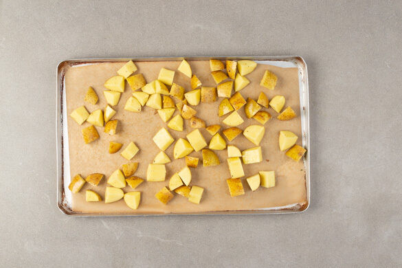 Den Backofen auf 240°C (220°C Umluft) vorheizen. Die Kartoffeln samt Schale in ca. 2cm große Stücke schneiden, mit 1EL Pflanzenöl sowie je 1 Prise Salz und Pfeffer vermengen und auf einem mit Backpapier ausgelegten Backblech verteilen. In den Backofen geben, auch wenn dieser ggf. noch vorheizt, und 5–7Min. backen.