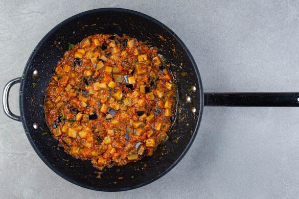 Die Auberginen und die Tomaten in einer mittelgroßen Pfanne mit 2EL Olivenöl bei mittlerer Hitze ca. 8Min. braten, bis das Gemüse weich ist. Den Knoblauch und den Oregano unterrühren und ca. 1Min. mitbraten, dann 150ml Wasser hinzugeben und alles ca. 5Min. köcheln lassen.