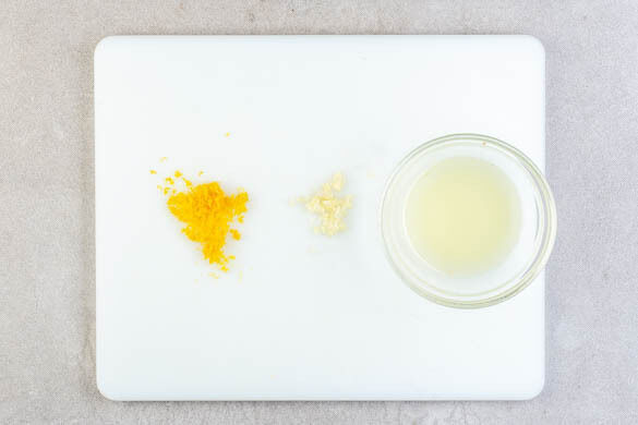 Den Knoblauch schälen und fein würfeln. Die Zitronenschale abreiben, dann die Zitrone halbieren und auspressen.