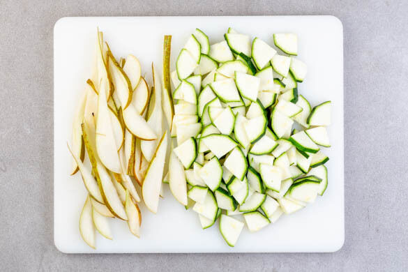Die Zucchini längs vierteln und in dünne Scheiben schneiden. Die Birnen vierteln, entkernen und längs in dünne Scheiben schneiden.