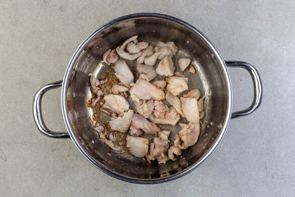 Das Fleisch mit etwas Küchenkrepp trocken tupfen, in ca. 2cm große Stücke schneiden und in einem großen Topf mit 2TL Pflanzenöl bei starker Hitze 2–3Min. anbraten.