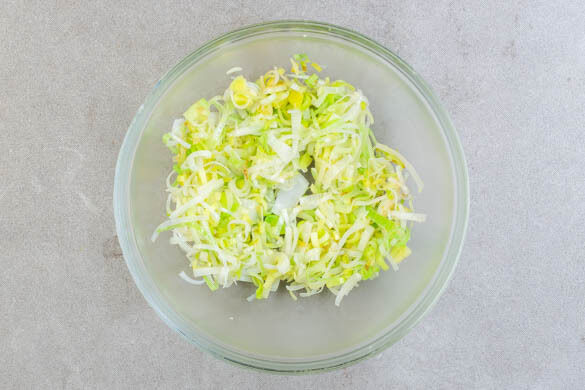 Den Lauch längs halbieren, dann in dünne Streifen schneiden. In einer großen Pfanne mit 2EL Pflanzenöl und 1 kräftigen Prise Salz bei mittlerer Hitze ca. 2Min. anbraten, bis der Lauch weich wird. In eine große Schüssel umfüllen. Die Pfanne auswischen und beiseitestellen.
