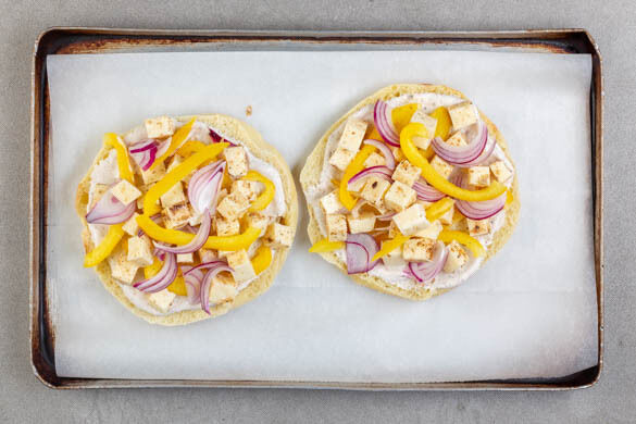 Die Bazlama horizontal halbieren, auf ein mit Backpapier ausgelegtes Backblech legen und mit dem Joghurt bestreichen. Mit der Paprika, den Zwiebeln und dem Paneer belegen, aber etwas Paprika und Zwiebeln für den Salat aufbewahren. Die Bazlama 5–6Min. im Ofen backen.