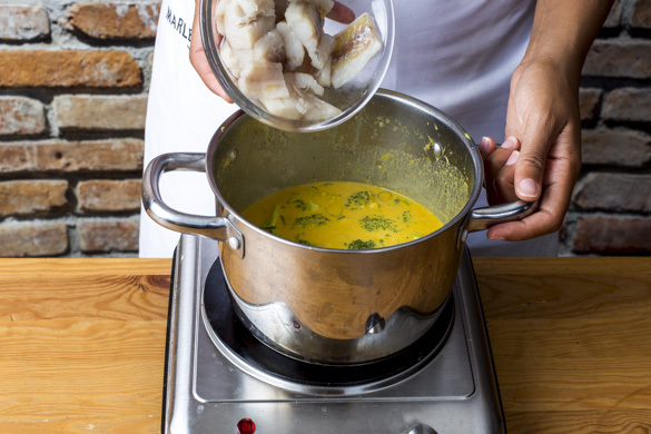 Den Fisch in die Suppe geben und 3–4Min. mitgaren.