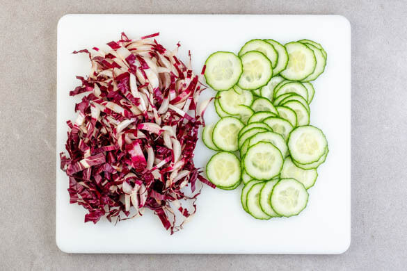 Die Gurken in hauchdünne Scheiben schneiden oder hobeln. Den Chicorée in feine Streifen schneiden.