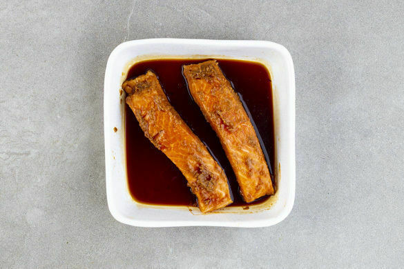 Den Fisch mit kaltem Wasser abspülen, trocken tupfen und evtl. vorhandene Gräten und Schuppen entfernen, dann in eine Auflaufform legen. Die Misopaste mit der ½ der Knoblauch-Ingwer-Paste verrühren und den Fisch damit einreiben. Mit der ½ der Sojasauce begießen und 10–12Min. im Ofen garen. Die Garzeit kann je nach Dicke der Fischstücke variieren.
