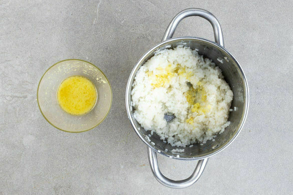 Das Sesamöl mit 2EL hellem Essig, 2TL Zucker und 1TL Salz verrühren, dann die restliche Knoblauch-Ingwer-Paste unterrühren. Ca. die ½ der Würzsauce unter den Reis mengen.