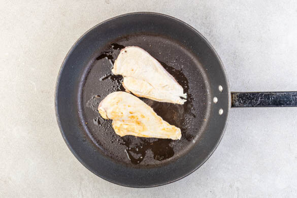 Das Fleisch trocken tupfen, horizontal halbieren und von beiden Seiten mit je 1 Prise Salz und Pfeffer würzen, dann in einer mittelgroßen Pfanne mit 1EL Olivenöl bei mittlerer Hitze auf jeder Seite 1–2Min. anbraten.