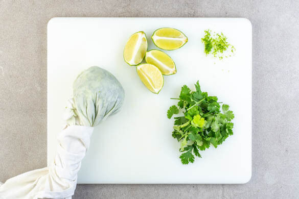Inzwischen die Gurken mit einer Küchenreibe grob raspeln und mithilfe eines Küchentuchs gut auswringen. Die Limettenschale fein abreiben, dann die Limette in Spalten schneiden. Den Koriander samt Stängeln grob schneiden.
