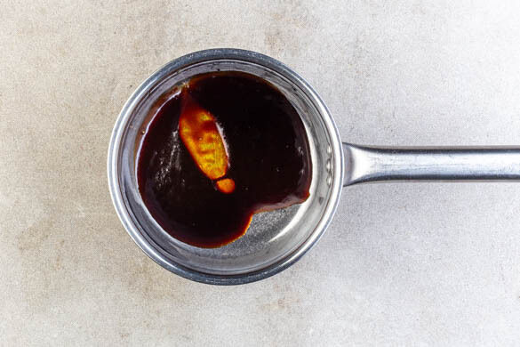 Währenddessen die Teriyakisauce in einem kleinen Topf bei mittlerer Hitze 1–2Min. sanft einköcheln lassen und gut mit 2TL Honig verrühren.
