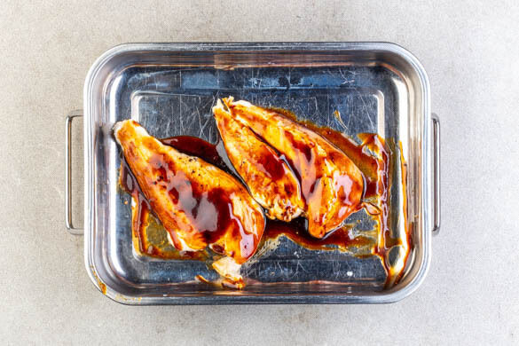 Das Fleisch in eine mittelgroße Auflaufform geben und von beiden Seiten mit etwas Teriyaki-Honig-Glasur bestreichen. Anschließend im Ofen 8–10Min. garen, dabei das Fleisch regelmäßig mit der Glasur bestreichen, bis alles aufgebraucht ist.