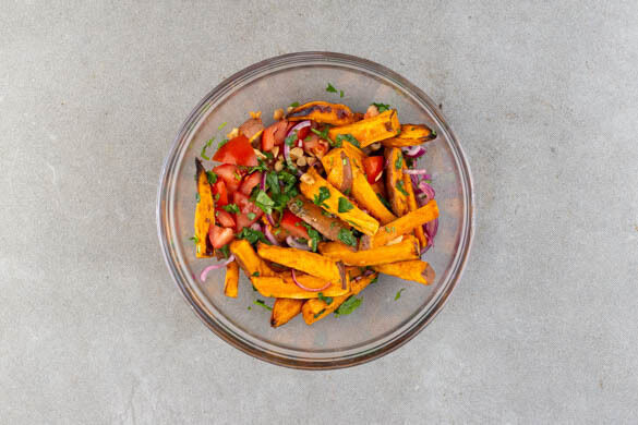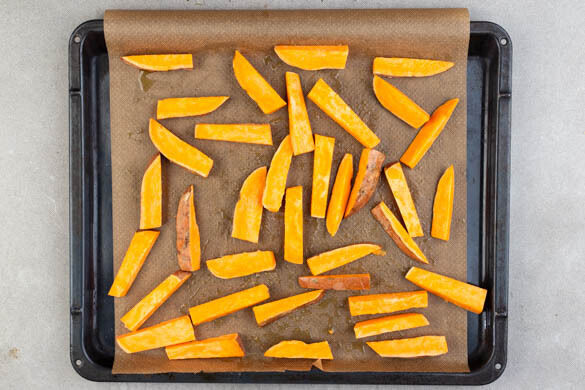 Den Backofen auf 240ºC (220ºC Umluft) vorheizen. Die Süßkartoffeln samt Schale in ca. 2cm dicke Stifte schneiden und auf einem mit Backpapier ausgelegten Backblech mit 4EL Olivenöl und 1TL Salz vermengen. Im Ofen 15–20Min. backen, bis die Süßkartoffeln leicht gebräunt und gar sind.