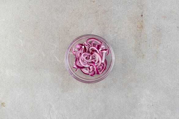 Die Limetten halbieren und auspressen. Die Zwiebel schälen, halbieren und in dünne Streifen schneiden. Die ½ des Limettensafts mit 1 kräftigen Prise Salz verrühren. Die Zwiebelstreifen mit dem Limettensaft vermengen und ziehen lassen.