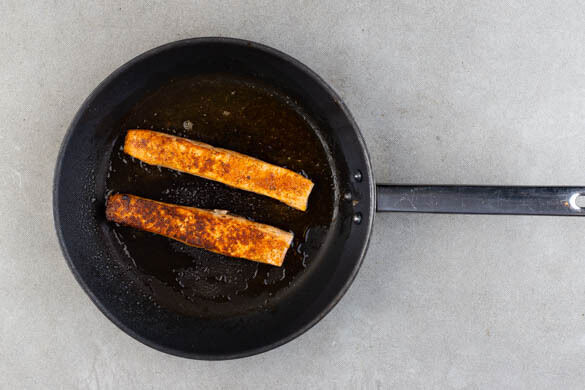 Den Fisch in einer großen Pfanne mit 1½EL Olivenöl bei mittlerer Hitze 3–5Min. auf der Hautseite braten, anfangs einmal mit einem Pfannenwender in die Pfanne drücken. Wenden und auf der anderen Seite 1–2Min. braten, bis der Fisch gar ist.