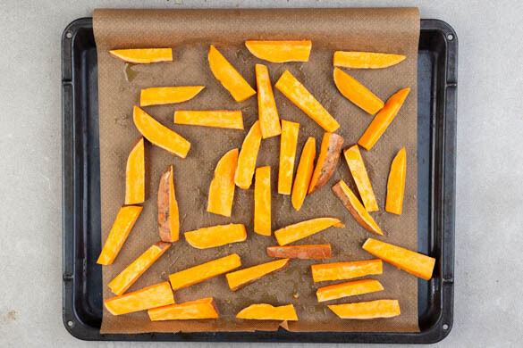 Den Backofen auf 240ºC (220ºC Umluft) vorheizen. Die Süßkartoffeln samt Schale in ca. 2cm dicke Stifte schneiden und auf einem mit Backpapier ausgelegten Backblech mit 2EL Olivenöl und ½TL Salz vermengen. Im Ofen 15–20Min. backen, bis die Süßkartoffeln leicht gebräunt und gar sind.